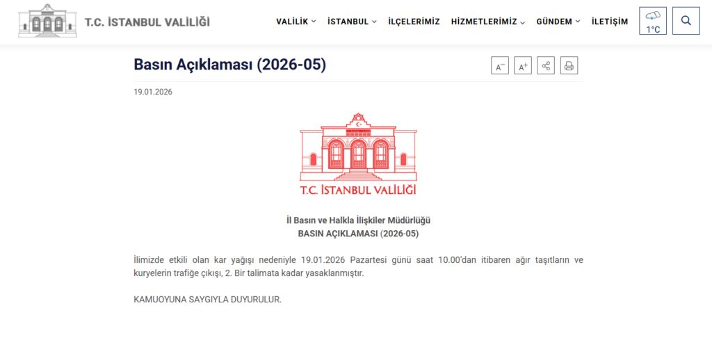 “İlimizde etkili olan kar yağışı nedeniyle 19.01.2026 Pazartesi günü saat 10.00’dan itibaren ağır taşıtların ve kuryelerin trafiğe çıkışı, 2. bir talimata kadar yasaklanmıştır”